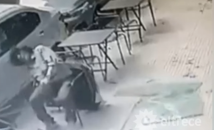 Las imágenes captadas por una cámara de seguridad de un edificio cercano muestran con crudeza el momento exacto en que un blindex se desprende desde varios metros de altura y cae directamente sobre la cabeza del hombre, de 50 años, que se encontraba sentado en una mesa al aire libre.